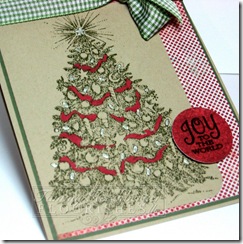 Tammy, how pretty....this set has moved from CAS to vintage to classic and now a rustic country feel....love that about this beautiful tree. Your gingham bow is the icing on this cake! tfs.