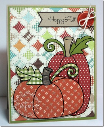 I got these great pumpkins from Outlines Rubber Stamps last year, and I just love ‘em for paper piecing. I stamped each pumpkin with Brilliance Graphite Black ink and embossed them with clear embossing powder before cutting out all the pieces. Then I used the “Happy Fall” sentiment from the Sweetest Pumpkin in the Patch ala’ modes set from My Favorite Things and stamped it on a Fishtail Flags STAX Die-Namics. I embellished with a button from the Mango Madness collection from eP, and tied it off with some ivory cotton string. The layout for my card is from sketch #30 at Retro Sketches this week.