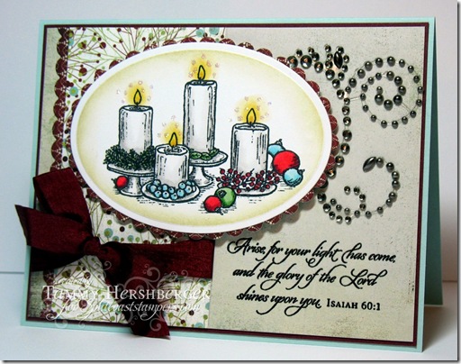This card uses the beautiful Christmas Candles stamp set which I stamped in Memento Tuxedo Black ink on Flourishes Classic Ivory cardstock. I die cut the image with a Nestabilities Petite Oval (I think they don’t make this die anymore, and I don’t know why… it’s always been one of my go-to dies…) and sponged inside the die with some Antique Linen ink. The candles were colored with Copics from the Poppy, Pistachio, Iced Aqua, Sunflower and Tonal Neutral collections (shown below). I added some bling with a gray pearl flourish and a glittery glow around the candles, and this rich burgundy ribbon. These papers are an old Basic Grey collection that I can’t remember the name of… maybe Figgy Pudding?
