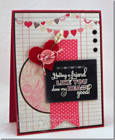 This card uses a sentiment from the darling Heartlines mini stamp set. I liked this sentiment because of the open letters within it that gave me space to add a little color with a Prismacolor pencil. I was also able to add the little row of hearts at the top, also from the stamp set. To create this look, you need some Flourishes Classic Black cardstock,